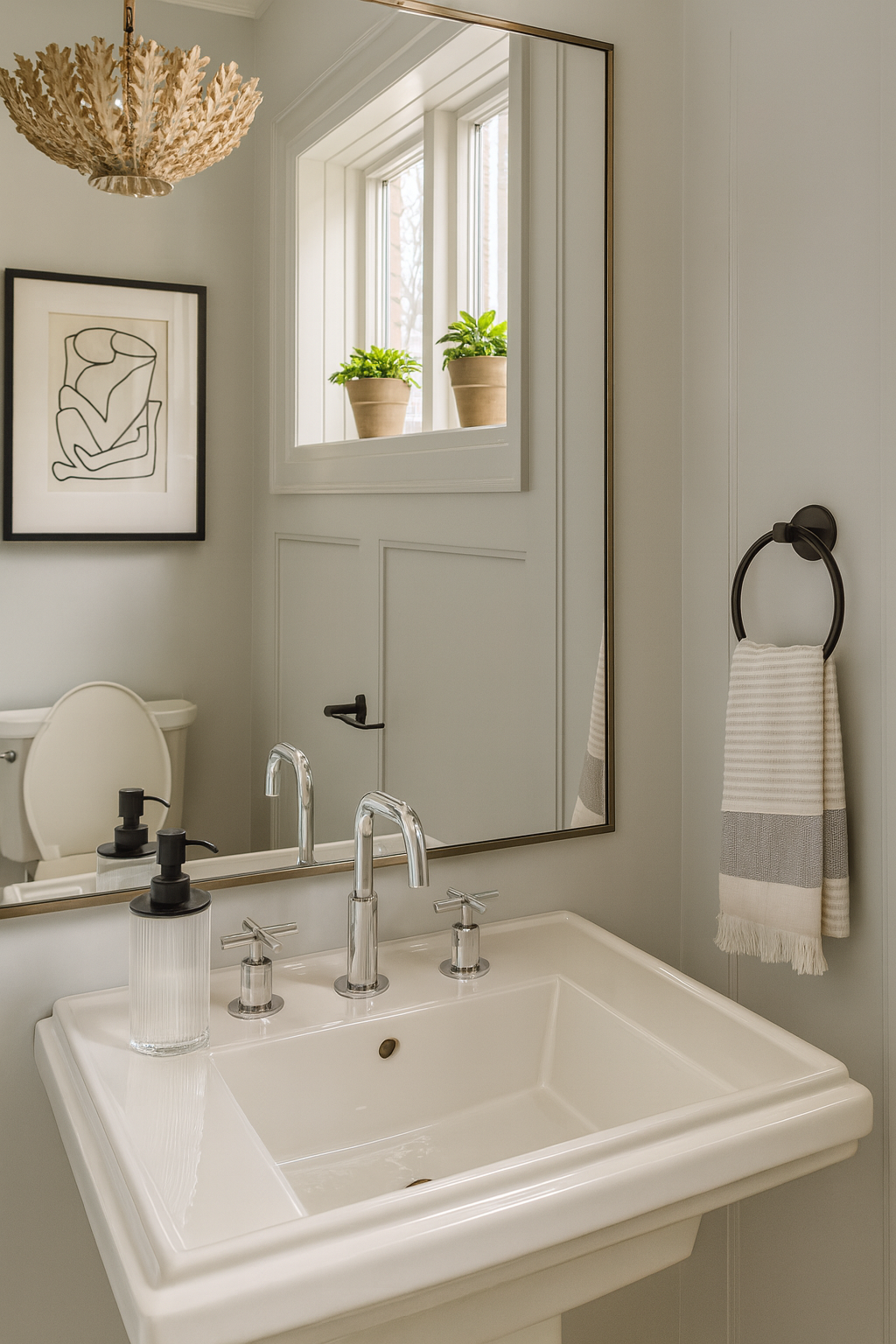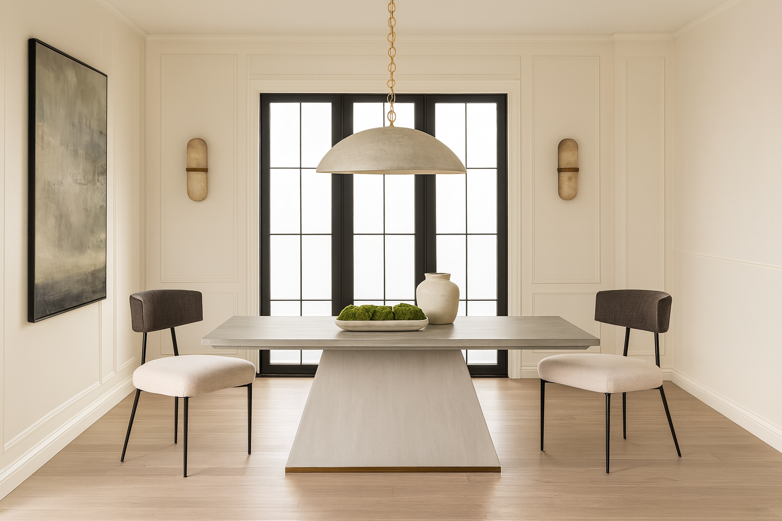 We were tasked with creating a cozy yet functional living space that fit the modern farmhouse aesthetic. We used neutral tones, navy accents, and added comfortable seating for four to six people. Durable fabrics and layered lighting create a welcoming and practical space for relaxing and gathering with family.